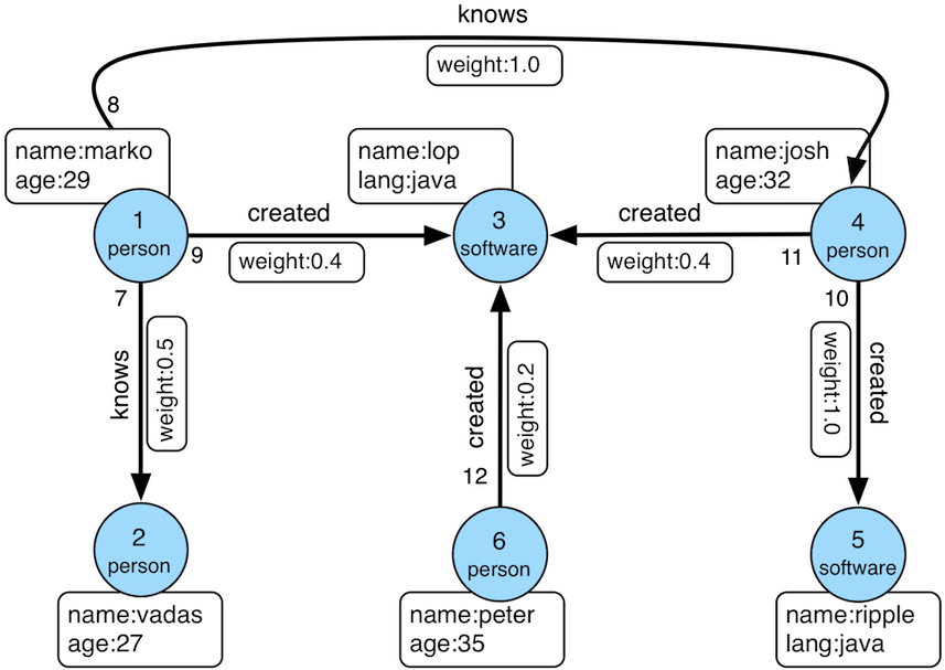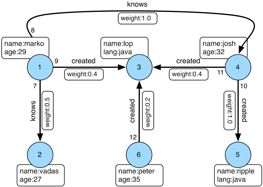 If you find yourself in a position where you need to ask a question on the Gremlin Users mailing list about a traversal that you are having trouble with in your application, try to convert the gist of it to one of the toy graphs. Taking this step will make it easier for advanced Gremlin users to help you, which should lead to a faster response time for your problem. In addition, there is the added benefit that the mailing list post will be more relevant to other users, as it is not written solely in the context of your domain. If the sample data sets don’t properly demonstrate your issue, then including a Gremlin script that can construct a small body of sample data would be equally helpful. |